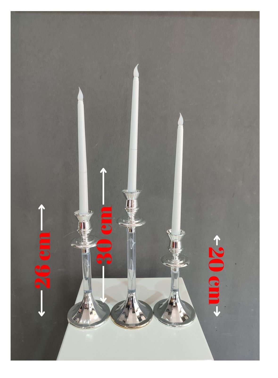 3'Lu Gümüş Mumluk 20-26-30 cm boyutundadır.